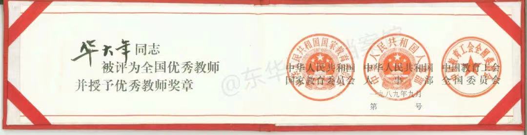 (1989年华大年教授获全国优秀教师证书)