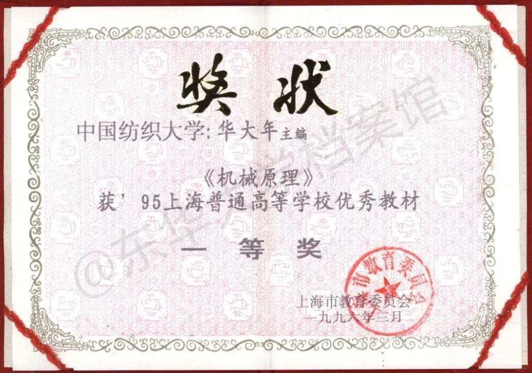(1996年《机械原理》获上海市教委优秀教材一等奖证书)