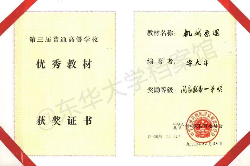 1982年,纺织部教育司副司长沈帆同志到我校调研,教务处徐灿华等同志介绍《应用机构学》一书,后在纺织部教育司的协调下,将《应用机构学》与《纺织机械机构学》(天津纺织工学院)去粗取精,合并为一本书,定名为《机构分析与设计》,华大年、唐之伟(天津纺织工学院)主编,篇幅我校占三分之二,天津纺织工学院占三分之一。华老师深知教材之于教学育人的重要性,强调做到“三结合”,即教学与科研相结合、基础与专业相结合、理论与实际相结合。作为“三结合”的产物,《机构分析与设计》成为我国公开出版发行的第一本高等机构学的研究生教材,一经出版广受好评。在1988年全国高校优秀教材评选中,这本书不负众望,摘得国家级优秀教材奖殊荣。