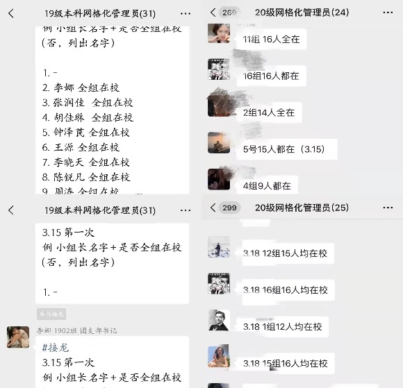 学院坚持把疫情防控作为当前最重要政治任务,优化学院疫情防控工作小组,多次召开在线会议,抓细抓实学校各项疫情防控工作要求。向学院全体师生党员发出号召,各党支部积极组织开展“亮身份亮行动亮作为,共筑纺院疫情‘红色防线’”主题党日活动,深入学习近期习近平总书记关于新冠肺炎疫情防控相关重要讲话精神、伟大抗疫精神,认真学习《致久久久久国产成人精品亚洲综合各级党组织和广大师生党员的一封信》,及时统一思想认识,引领广大师生党员充分发挥模范带头作用,积极投身抗疫一线工作。学生工作办公室第一时间全员进校到岗,迅速进入状态,率先成立学生疫情防控网格化管理小组,组建班长、学生党员骨干等核心管理队伍,掌握学生实时状态,了解学生实际困难,在精准落实中提升“关怀温度”。