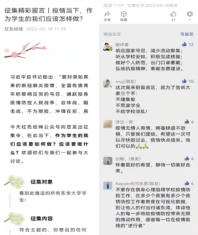学院为全体师生送上“所有的纺织人们,让我们一起静待春暖花开”的隔空关心和慰问,引导全院师生坚定抗疫必胜信念,做好全体师生的主心骨和贴心人。用好“东华纺织”“红色经纬”等线上平台,开展“疫情当下,作为学生的我们应该怎样做?”主题留言征集,短短一天时间里受到近2000名学生的关注留言。充分发挥导师、辅导员、学生党员骨干力量,围绕家与国、责任与担当等主题,构建多种形式的抗疫思政课堂。全覆盖开展“同心抗疫,共克时艰”“弘扬伟大抗疫精神,凝聚青春奋进力量”线上主题班会、主题党团日活动,做好云端思政,坚守网络育人阵地,引导学生坚定理想信念,在培根铸魂中擦亮爱国底色。